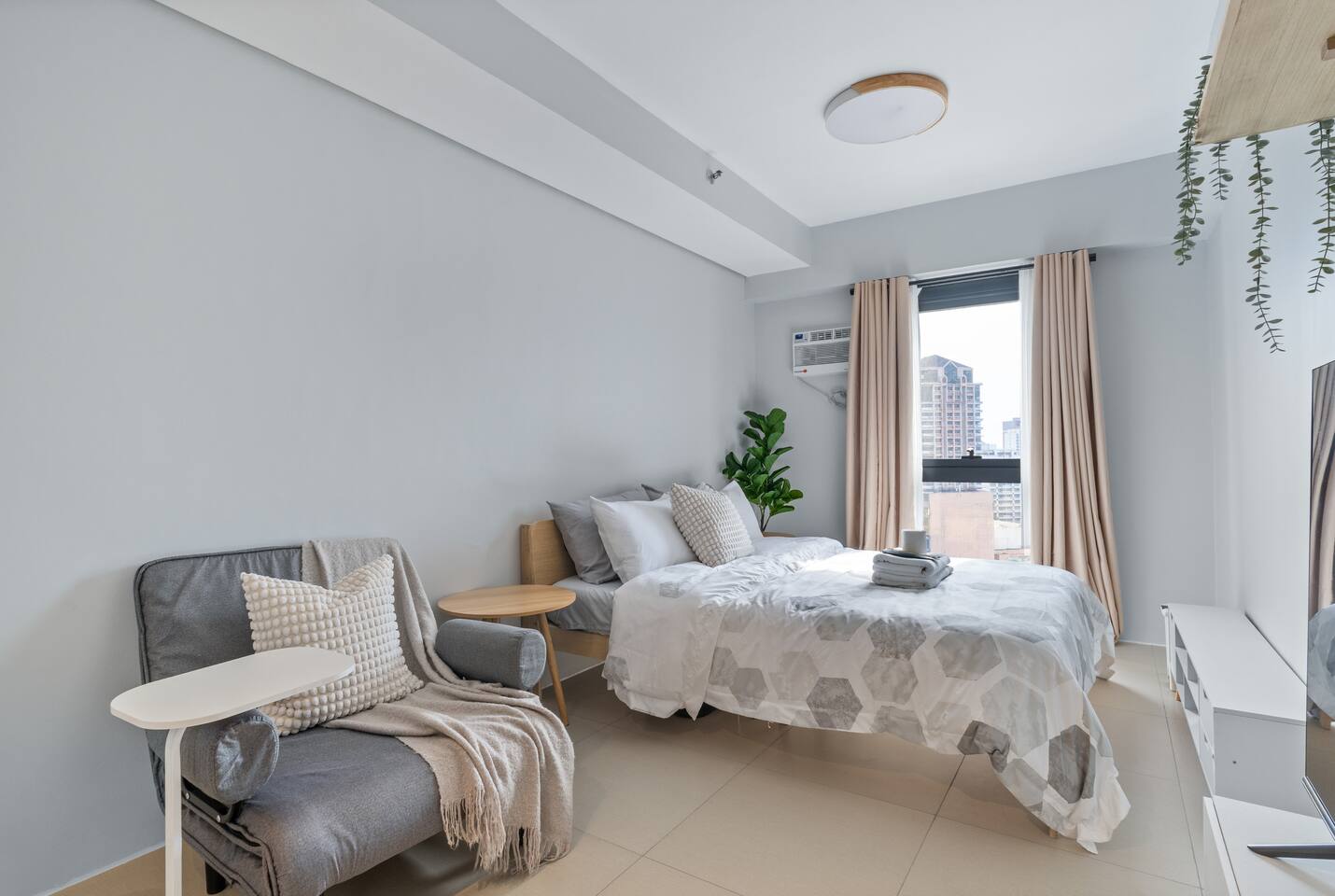 What’s inside? 1. Bright, airy layout with large window and city views. 2. Comfortable Queen size bed with quality linens and plush pillows. 3. Cozy seating area - sofa, armchair, and a small coffee table. 4. SmartTV with streaming options for relaxing evenings. 5. Fully equipped kitchenette (compact but functional) for light cooking. 6. Clean, contemporary bathroom with essential toiletries 7. 1.5 HP Air conditioning UNIT for year-round comfort For your Comfort & Convenience, the following are also provided: Free high-speed Wi-Fi Fresh towels and linens provided Hairdryer, iron, and ironing board Clothing rack On-site pay parking (basement) Location Perks!! 1. Steps to public transit and major bus lines and MRT Station. 2. Close to malls - Fisher Mall. The Landmark. Sm North Edsa. Ayala Vertis North. 3. Essential access to Philippine heart center and Philippine lung center. Just 8-9 minutes drive away. Our Unit is Ideal for short breaks or remote work stays. Essential travelers, Couples, solo travelers, and small group of 3 looking for a stylish, hassle-free space.